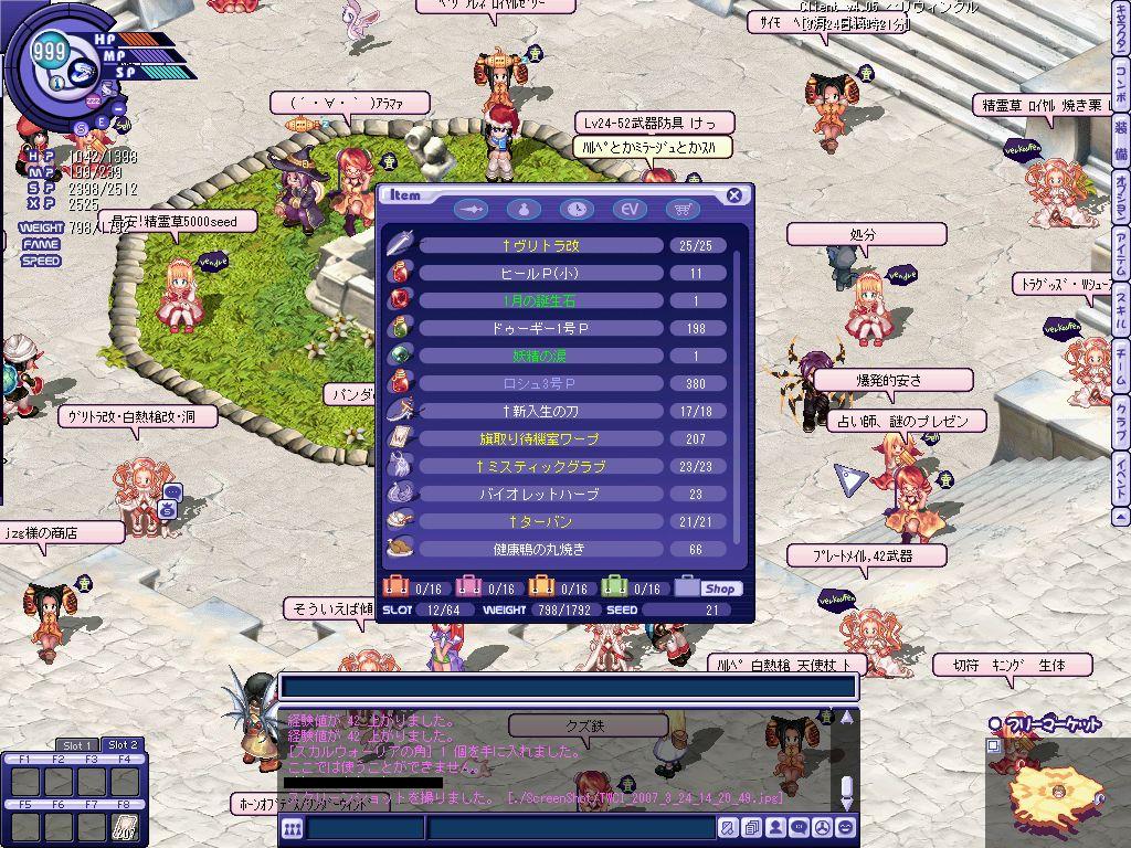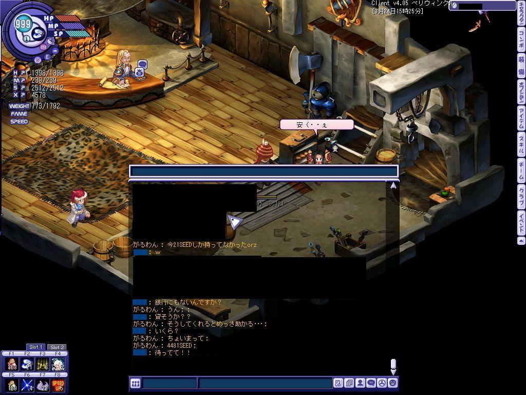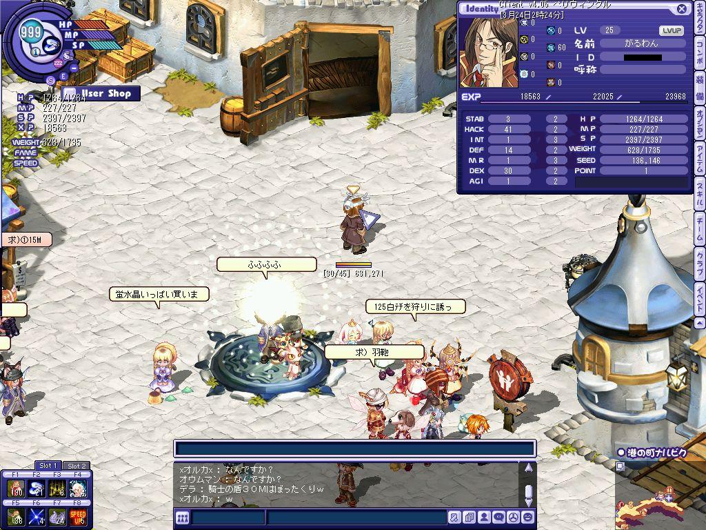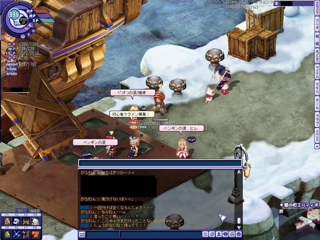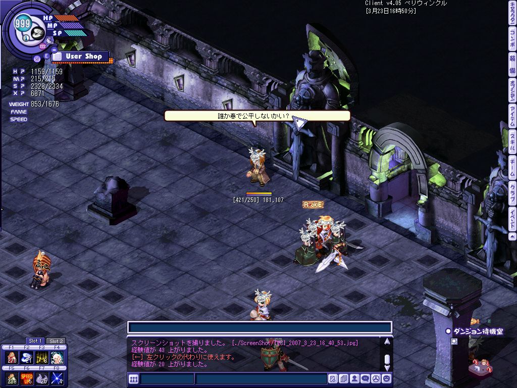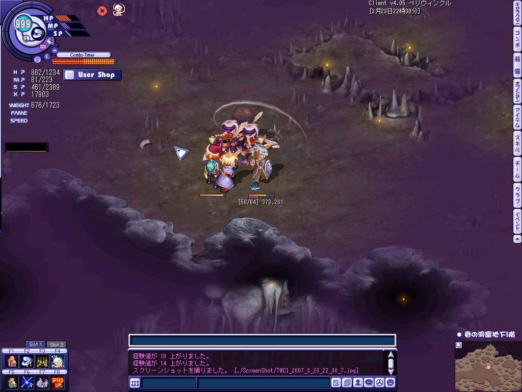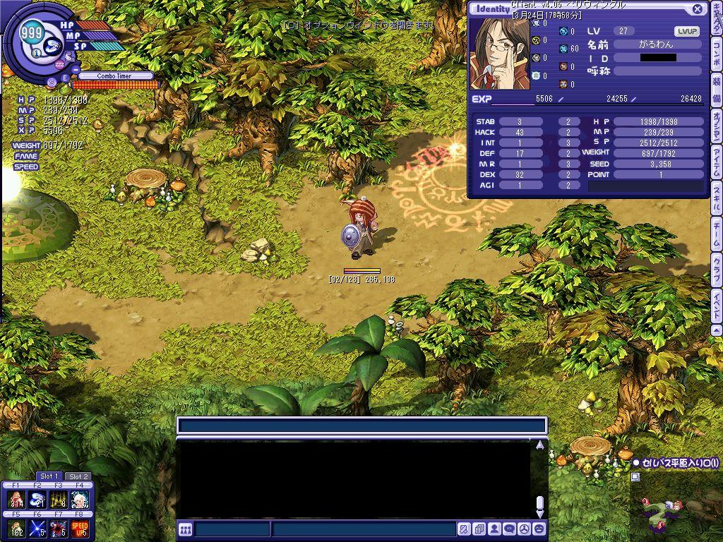 でもこないだできた知り合いから狩りに誘われる。POTは溜め込んであったので狩りまくる。その知り合いのミラさんと少しレベル差が開いたためいろんな狩場試してみる。
